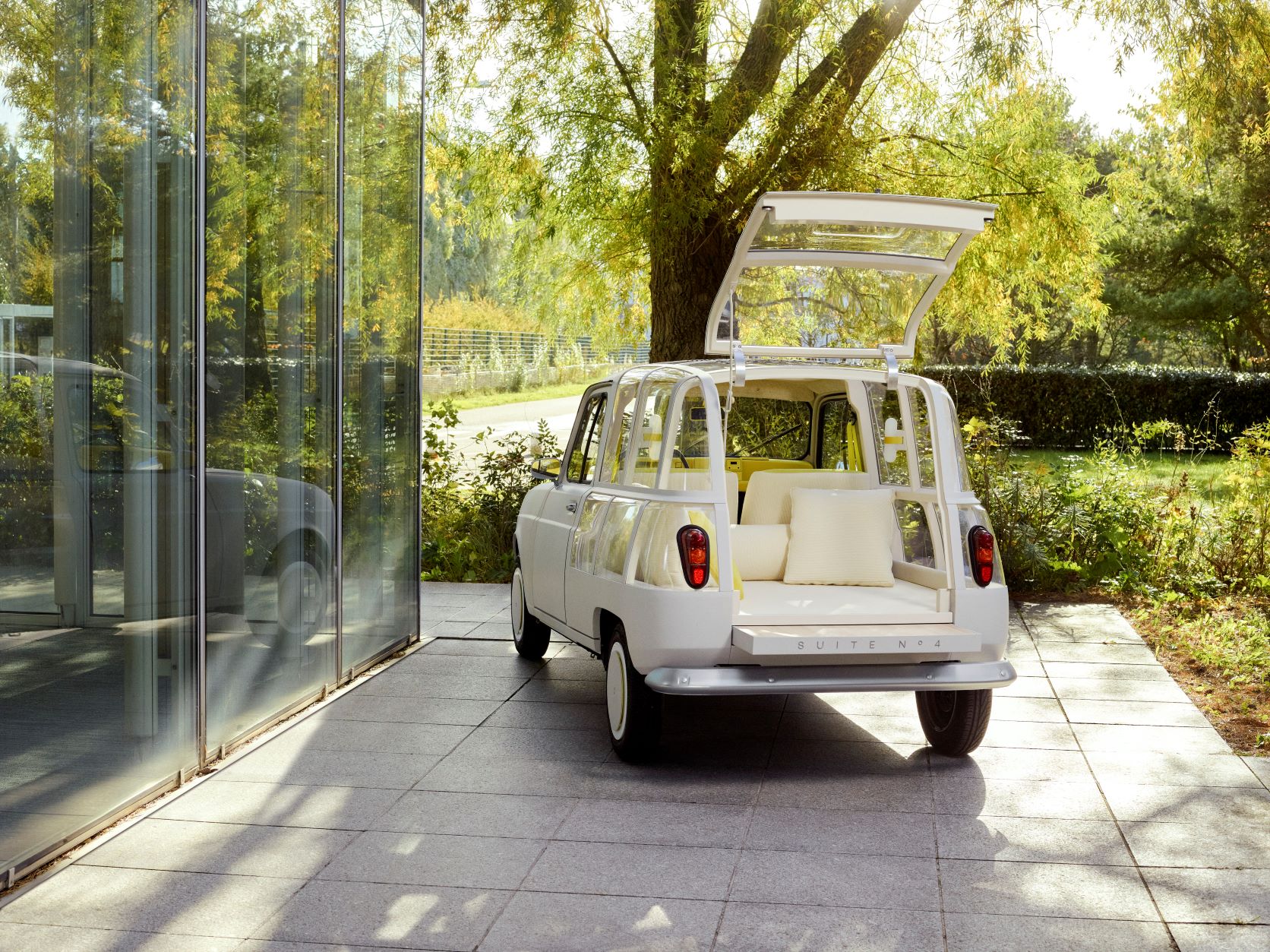 Et pour terminer, ou presque, les célébrations, Renault s’est associé au designer Mathieu Lehanneur pour réinventer la voiture. Le résultat, assez surprenant, est SUITE N°4, un concept inspiré par l’esprit d’une suite d’hôtel nomade. Une nouvelle expérience automobile, en sorte : une voiture à vivre à l’intérieur comme à l’extérieur. De face, on retrouve les feux ainsi que les lignes originelles. La calandre en aluminium poli est à la fois la signature du designer et une ode à l’évasion. Mais si le concept conserve les proportions et les lignes extérieures du modèle iconique, il est néanmoins radicalement transformé. La carrosserie de la partie arrière et le hayon sont remplacés par une verrière en polycarbonate qui apporte la transparence et luminosité d’une architecture de verre. Sur le toit, une grille de panneaux solaires laisse passer les rayons du soleil en transparence et, en même temps, aide à recharger la batterie du véhicule, rétrofité et désormais 100% électrique.
