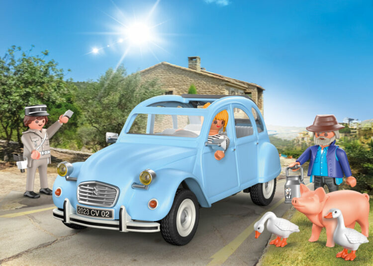 Un esprit joyeux qui selon la marque aux chevrons, se retrouve dans la teinte bleu ciel de la 2 CV Playmobil et dans les accessoires qui la complètent : un paysan accompagné de ses oies, de son cochon et de ses pots de lait, une conductrice en marinière au look baba-cool et enfin un gendarme, clin d’œil à un célèbre maréchal des logis-chef d’un film populaire français. En complément, une plaque d’autocollants repositionnables permet à chacun de personnaliser sa 2 CV Playmobil.
