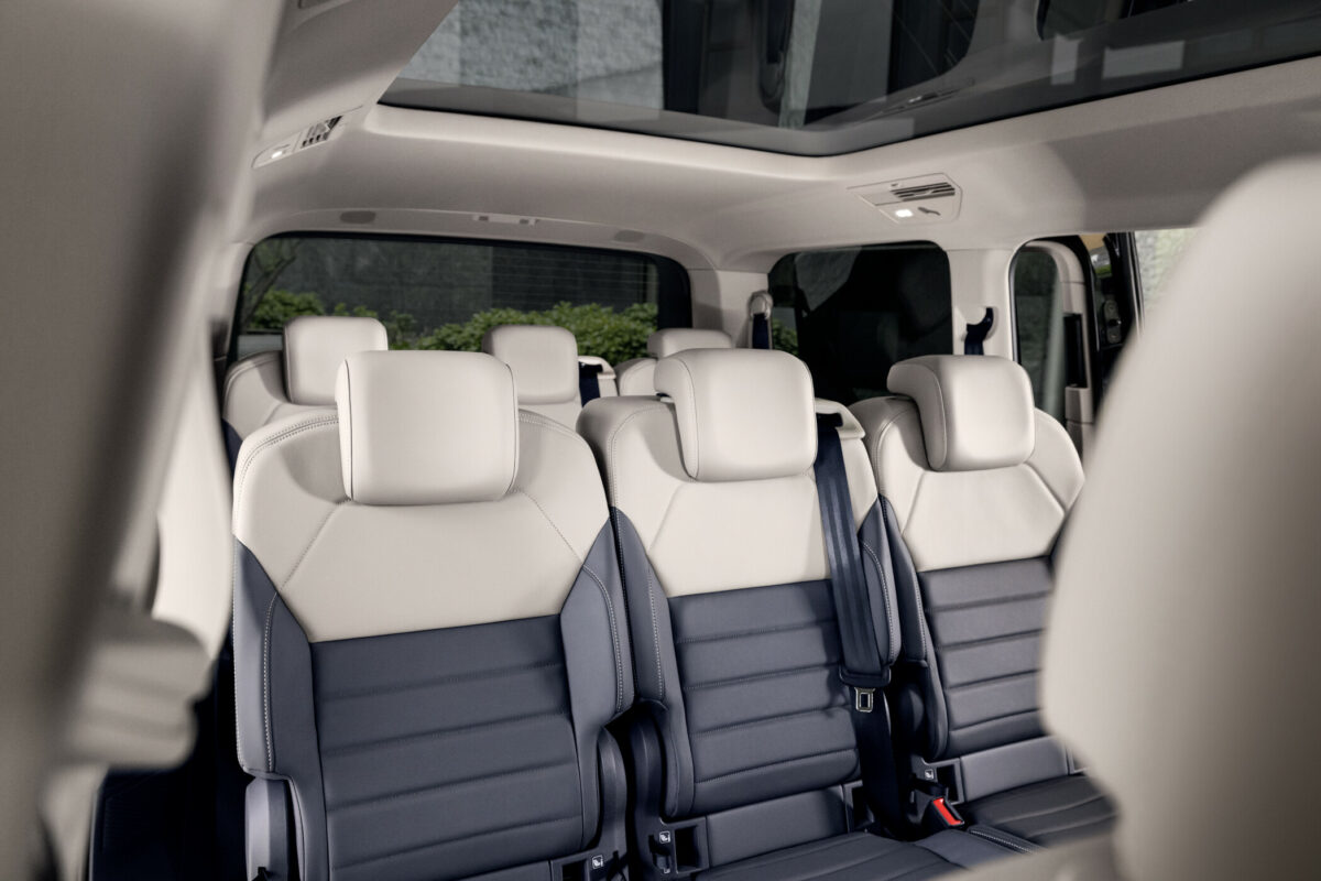 La déclinaison huit places du Multivan est disponible sur l’ensemble des finitions, sur la base de la version avec porte-à-faux allongé à l’arrière (longueur totale : 5 173 mm). Les finitions « Life » et « Style » sont proposées, en sortie d’usine, en version sept places de série sur la motorisation eHybrid (configuration avec deux places sur la deuxième rangée et trois places sur la troisième rangée) et en configuration huit places sur la motorisation TDI (avec deux tablettes rabattables sur le dossier des sièges de la deuxième rangée).