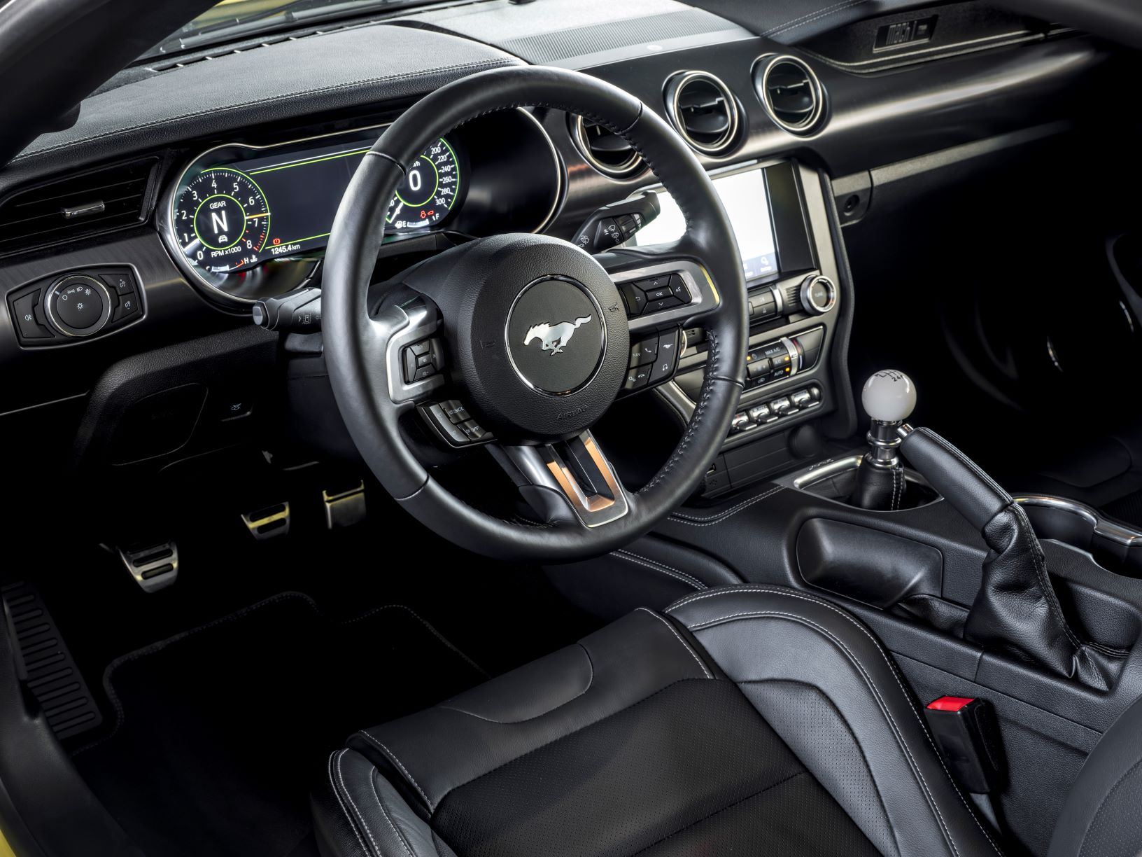 Ford précise qu’on retrouve les lignes historiques de la Mustang Mach 1 grâce notamment à la grille de calandre noire inspirée directement des traits du modèle des années 1970. Tout en respectant l’esprit originel de la Mach 1, cette version apporte ses propres spécificités comme des jantes de 19 pouces exclusives ou des bandes spécifiques bi-tons sur le capot et les jupes latérales, coordonnées à la couleur de carrosserie.