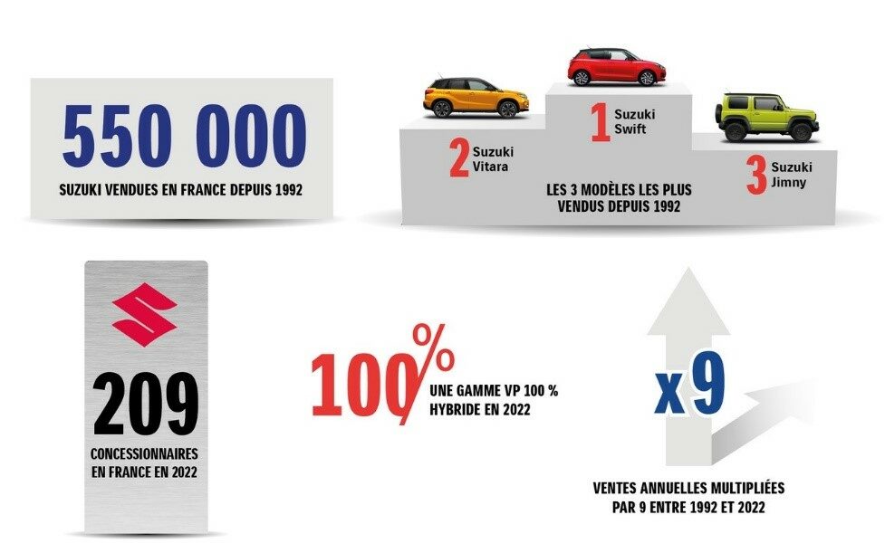 - 183 000 immatriculations pour la Suzuki la plus vendue en France sur 30 ans : la Swift (générations 1, 2 et 3). Elle est accompagnée sur le podium des ventes par le Vitara (117 000 exemplaires) et le Jimny (86 300 exemplaires).