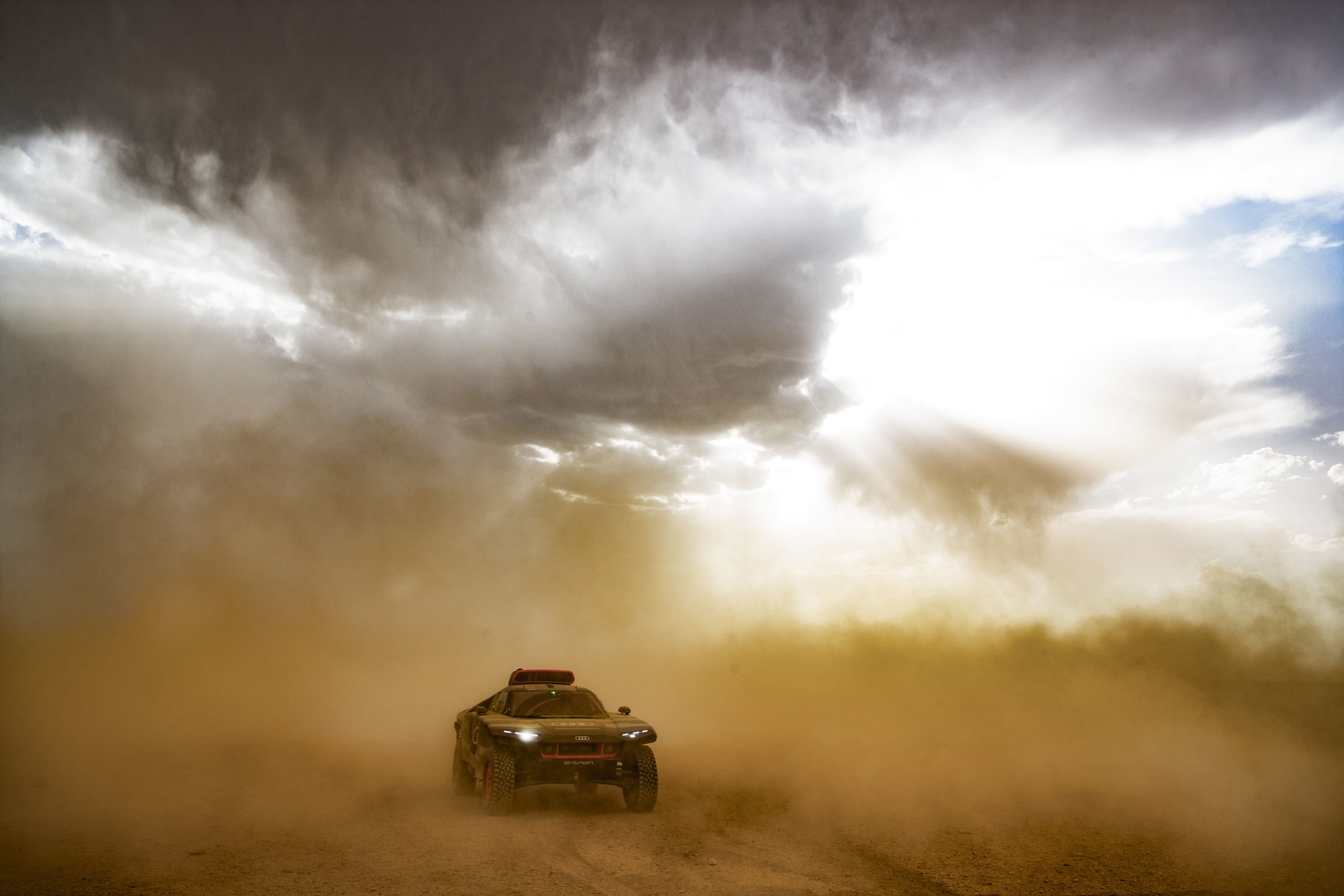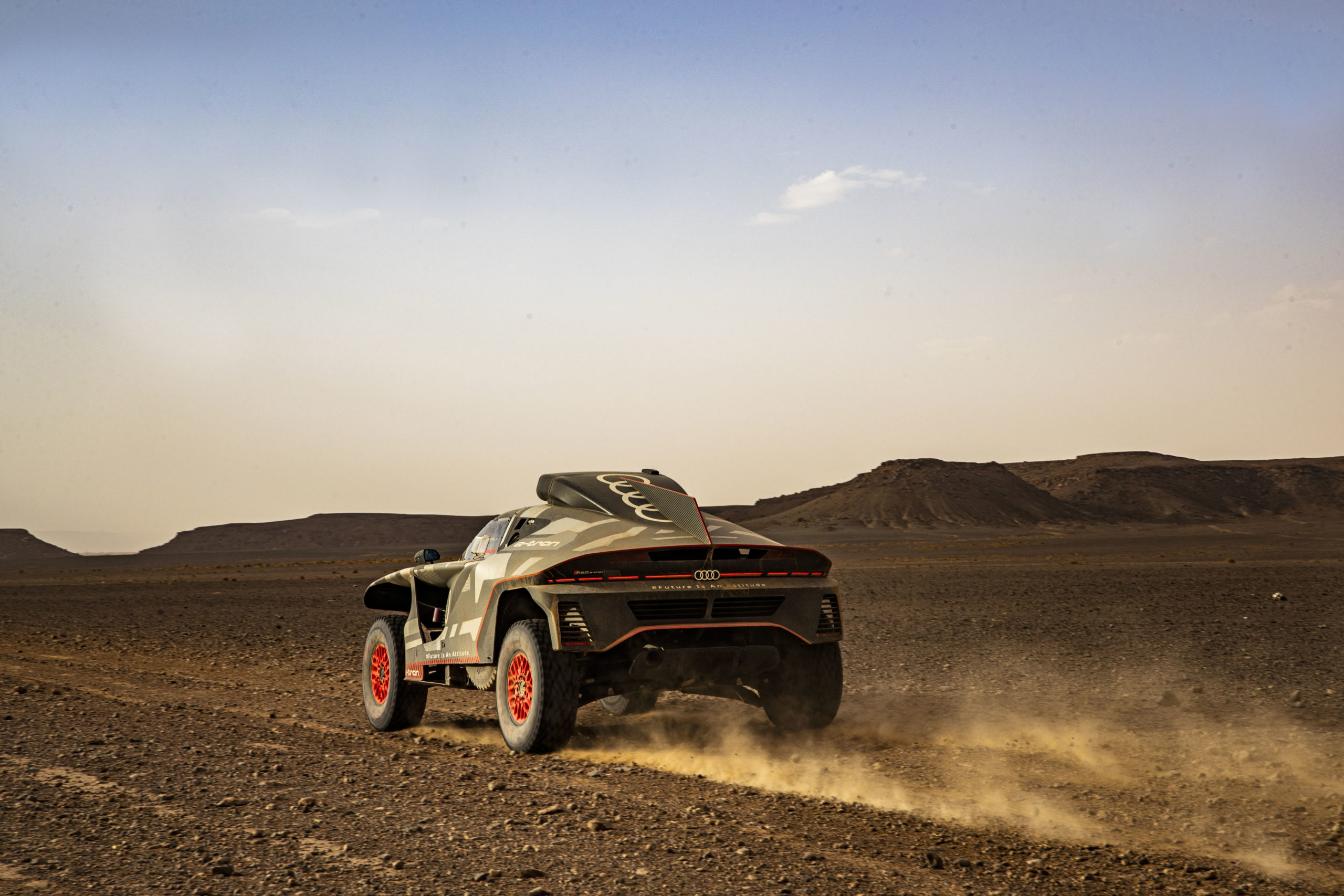 Au programme de l’Audi RS Q e-tron, chaleur et tempête de sable. Après l’Allemagne et l’Espagne, près de Saragosse (vraisemblablement dans les Bardenas) l’équipe n’a pas été privée de désert et de dunes lors de cette session d’essais dans la chaleur marocaine. Une fois de plus, les trois équipages : Stéphane Peterhansel, vainqueur du record du Dakar, Carlos Sainz et Mattias Ekström se sont relayés au volant du prototype au côté de leurs copilotes Edouard Boulanger, Lucas Cruz et Emil Bergkvist. Parmi les « sujets » de travail, figurait justement l’espace disponible dans le cockpit pour les équipages. Pour ce test marocain, des modifications ont été apportées afin que conducteurs et copilotes se sentent plus à l’aise.