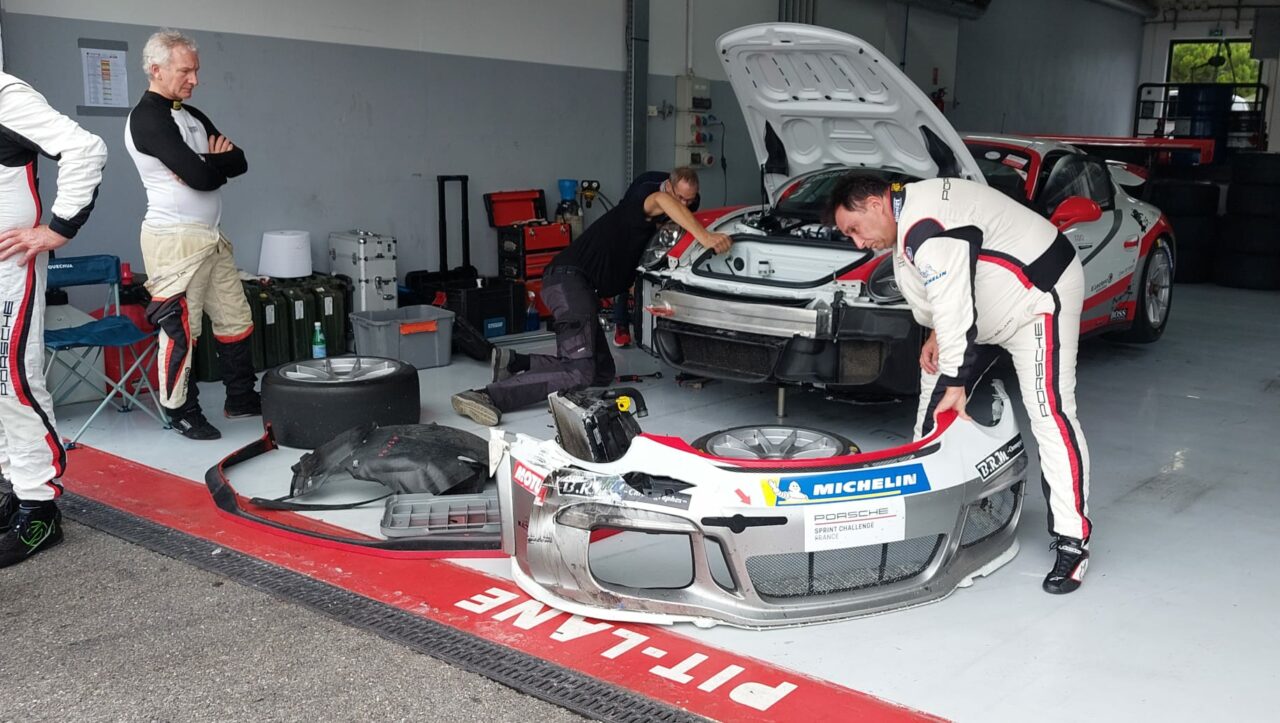 Arrivent les qualifs, la pluie a arrêté de tomber, mais la piste est encore humide, nous prenons le pari de partir en slicks, ce sera le bon choix, je réalise le 4ème temps. Mon équipier sera victime d’une petite touchette dans sa séance, nécessitant le remplacement du radiateur avant-droit et la pose de scotch américain sur le pare choc.