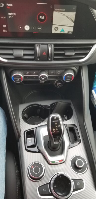 Mais foin de détails techniques, certes importants, qui ne doivent pas occulter le fait que la Giulia est une Alfa, une vraie. Un châssis et des suspensions fermes mais confortables qui posent l’auto sur la route avec une grande précision, le choix entre 3 modes de conduite, une transmission intégrale Q4 efficace et un moteur de 280 chevaux et 400 Nm de couple associé à une boîte ZF à 8 rapports qui ne le sont pas moins : voilà en quelques mots le programme des réjouissances qui nous étaient destinées. Et même si on ne reçoit pas de « coup de pied aux fesses » à l’accélération on se rend vite compte que la cavalerie est bien présente. Ces chevaux-là sont fougueux et entraînent la voiture de courbe en courbe sans rechigner à la tâche, quelle que soit la qualité du revêtement. Et pour peu que le sélecteur de mode de conduite soit positionné sur le « D » on s’imagine volontiers dans une spéciale de rallye. Un vrai régal ! D’autant que les sièges avant assurent un maintien digne des grandes sportives et que les immenses palettes situées de part et d’autre du volant permettent d’y garder les deux mains tout en maîtrisant la gestion de la boîte automatique.