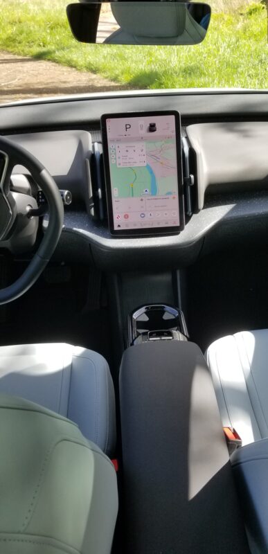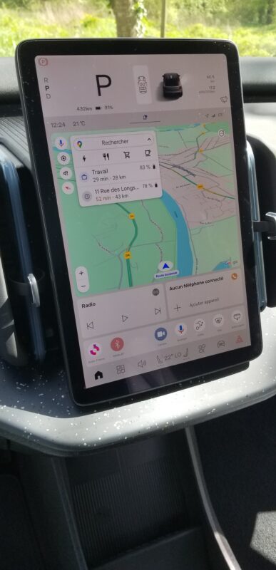 Ne cherchez pas de compteur de vitesse numérique ou analogique devant le volant … il n’y en a pas. Tout est sur cet écran central vous dis-je. La vitesse, la navigation, l’autonomie, la climatisation, le réglage des rétros, les différents centres d’intérêt (bornes de recharge, bons restos, hôtels disponibles…), bref tout est là… même la commande d’ouverture de la boîte à gants, c’est vous dire.