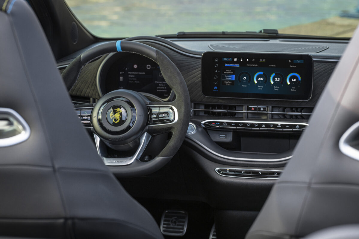 Abarth précise que le conducteur trouvera deux grands écrans face à lui: un large système d’infodivertissement à écran tactile de 10,25 pouces – l’Uconnect radio avec navigation, incluant de nouvelles pages dédiées à la gestion de la performance, et un écran TFT couleur de 7 pouces avec des graphismes Abarth dédiés, tous deux de série. Les pages de gestion de la performance ont été spécialement conçues pour la nouvelle Abarth 500e et permettent aux clients de suivre leurs performances tout en laissant libre cours à leur plaisir de conduire. Et la 500e est équipée d’un système sonore offrant une expérience sensorielle unique. Ce dernier reproduit, à l’intérieur de l’habitacle, le son d’une guitare rock chaque fois que la voiture est démarrée ou arrêtée.