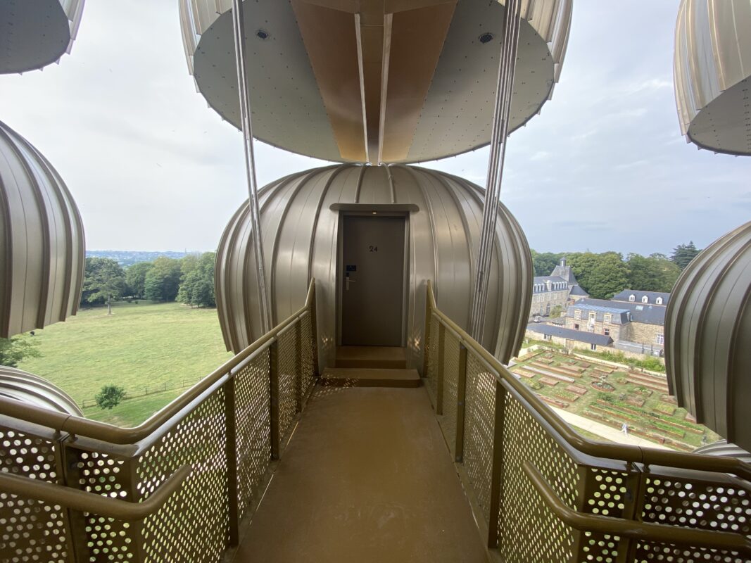 Des chambres de 26 m2 dans des cellules portées sur une structure en métal, imaginée par le propriétaire des lieux, Jean Paul Legendre, et mis en scène par un cabinet d’architecte, qui a osé, et qui a fait breveter cette réalisation inédite en France. 36 de ses chambres, de ses bulles, constituent la structure en forme d’arbre jusqu’à 28 mètres de hauteur, et 6 sont installées au sol pour accueillir les personnes à mobilité réduite.