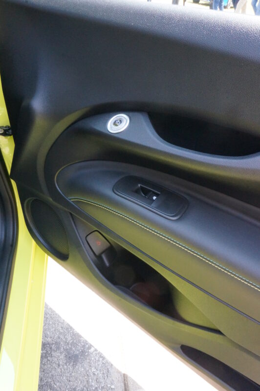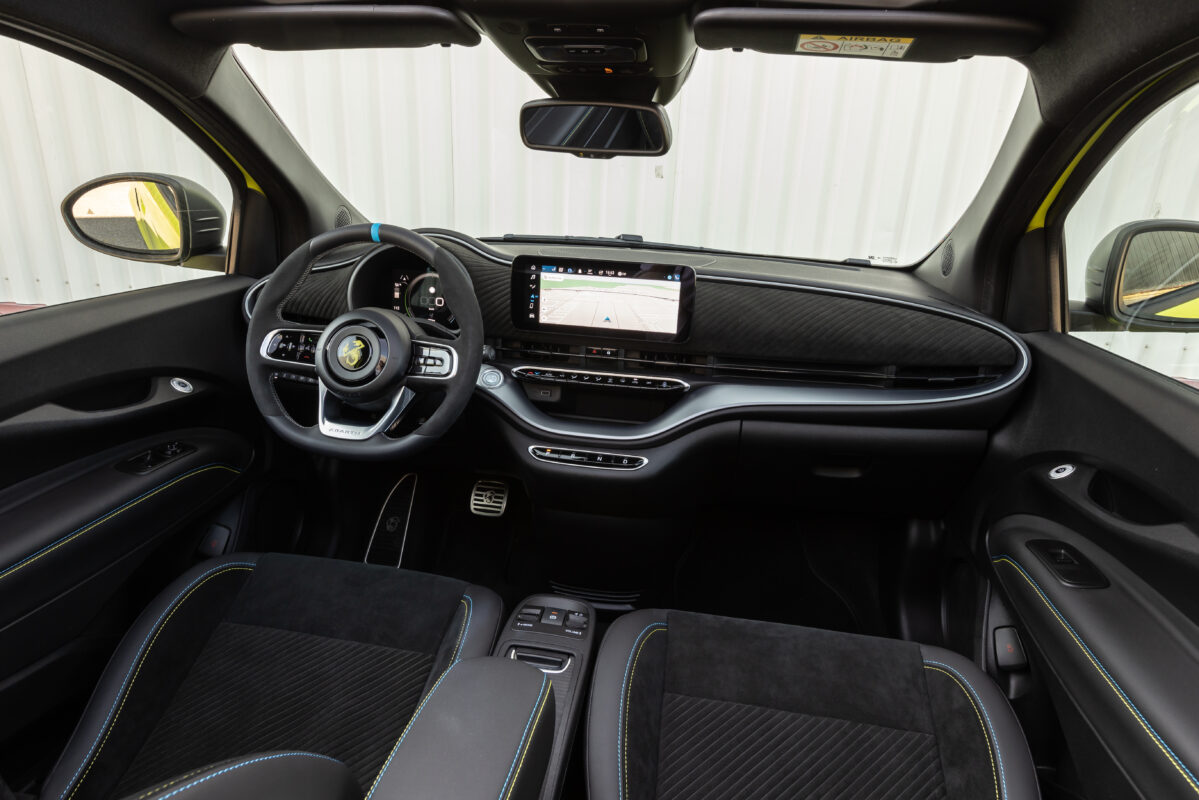 Au delà des couleurs qui ne manqueront pas de se faire retourner les passants, l’exercice de style est plutôt réussi. Tout, dans l’apparence de cette 500e survitaminée respire le dynamisme. Un empattement plus long de 24 centimètres et une largeur de voie supérieure de 6 cm par rapport au modèle thermique posent le décor. Et l’intérieur annonce lui aussi les prétentions de cette petite bombe. Volant recouvert d’Alcantara, tout comme la planche de bord, sièges profonds et enveloppants… L’ADN Abarth est là. Y’a plus qu’à !